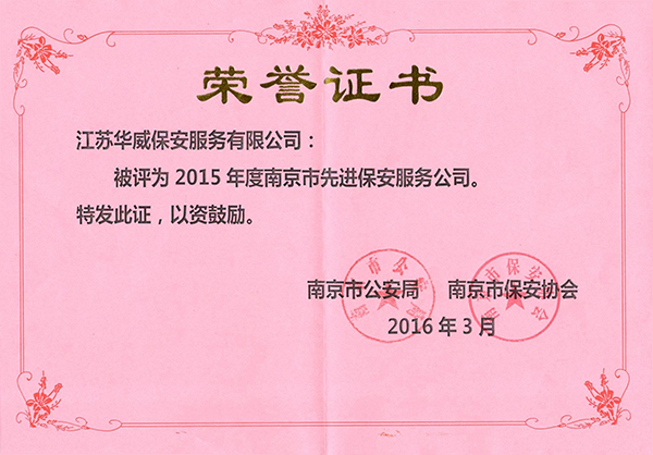3月31日,南京市2015年度先進(jìn)保安服務(wù)公司頒獎(jiǎng)活動(dòng)隆重舉行。江蘇華威保安服務(wù)公司成為受表彰的先進(jìn)企業(yè)之一。